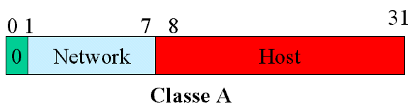Al massimo vi sono 128 reti di classe A. Ogni rete di classe A ha 16 milioni di indirizzi. Gli indirizzi di classe A sono riconoscibili in quanto il primo campo dell'indirizzo e compreso tra 0 e 127. Sono concepiti per poche reti di dimensioni molto grandi.