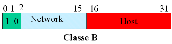 - Classe B: I primi 14 Bit indicano la rete e 16 l'Host.