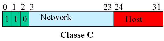 - Classe C: I bit che indicano la rete sono 21 e quelli che indicano l’Host 8.