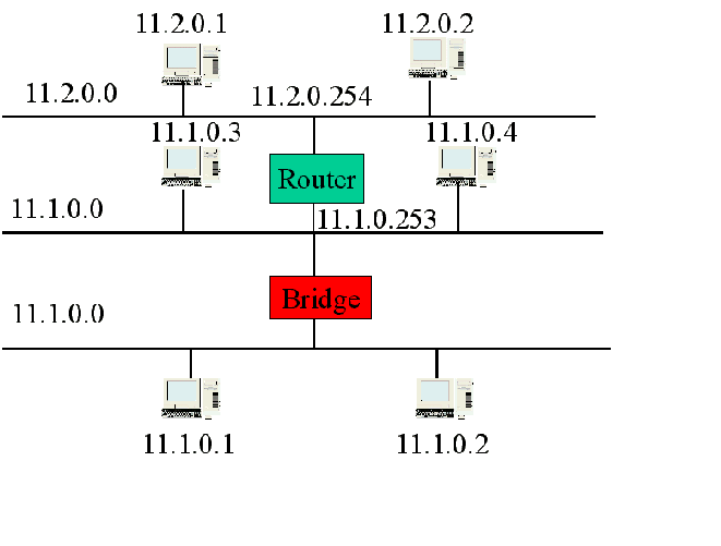 Nell'esempio sono presenti le subnet 11.1 e 11.2. Il Bridge collega reti Ethernet appartenenti alla stessa Subnet 11.1. Il bridge essendo trasparente ai protocolli di livello superiore, non ha indirizzi IP.